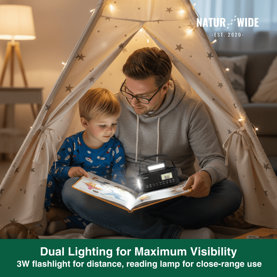 Never be without power again—use USB for home, solar for outdoors, or the crank for emergencies.